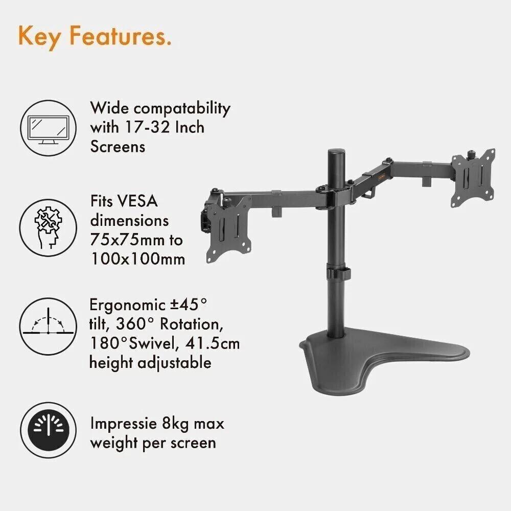 Professional Dual Arm Mount Included Heavy-duty steel dual monitor stand engineered for stability and flexibility: